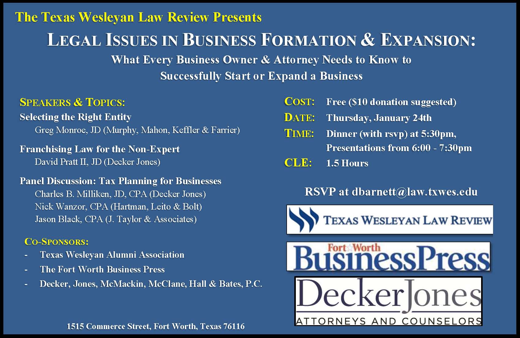I am pleased to announce that the Texas Wesleyan School of Law is presenting a program next week on current issues in business formation and expansion. I will be presenting a discussion on franchising, licensing, and internal expansion strategies as well as moderating a panel of experts on the tax planning considerations every business owner needs to be aware of in light of recent changes in the law, while my good friend Greg Monroe will be presenting his discussion on selecting the best entity for your business. This program is NOT JUST FOR LAWYERS. The topics discussed will be focused on providing quality information to the business community, while at the same time offering accredited CLE for attorneys. I hope you are able to attend. Please RSVP to dbarnett@law.txwes.edu.